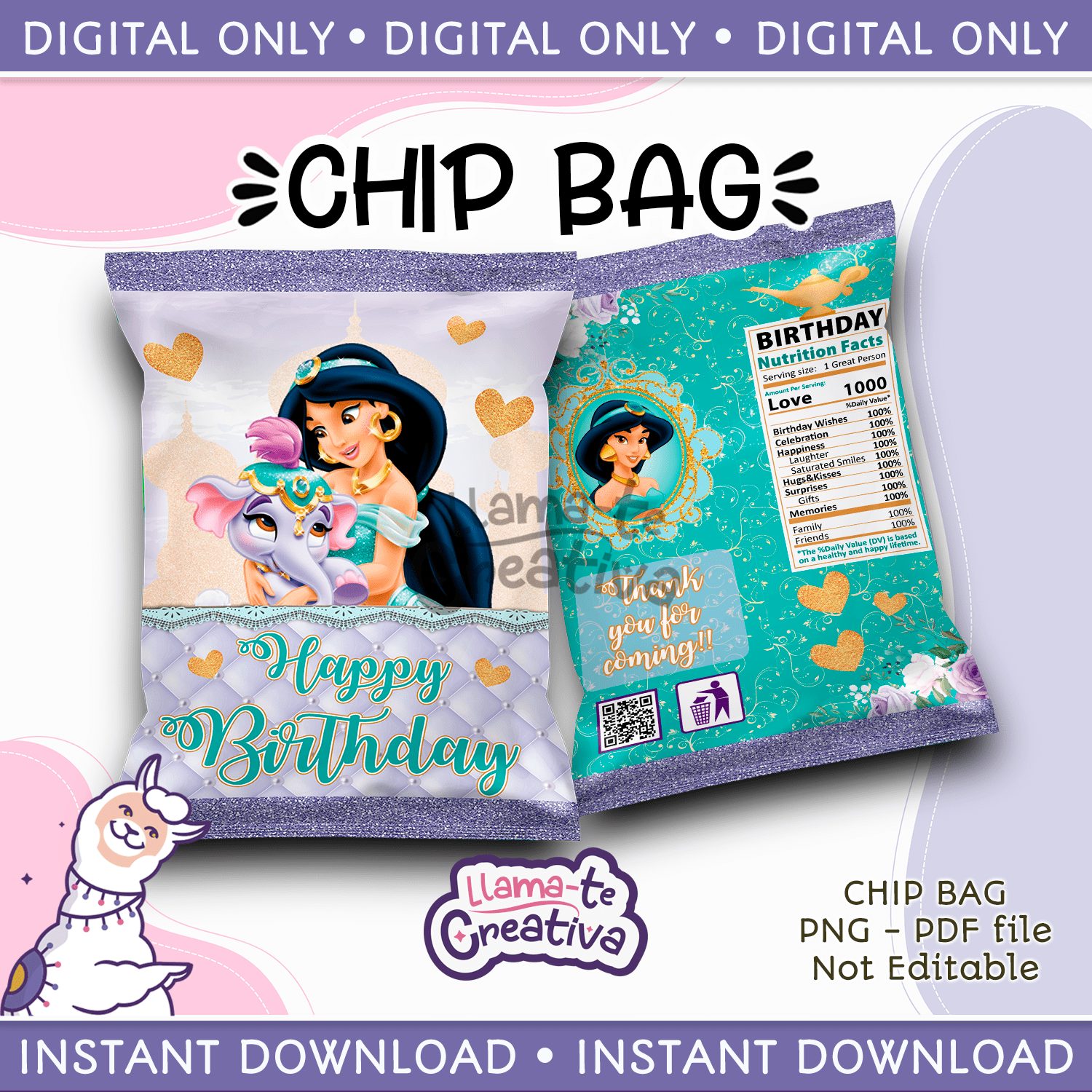 Arabian little princess Jasmine Chip Bag, Instant Download, not editable