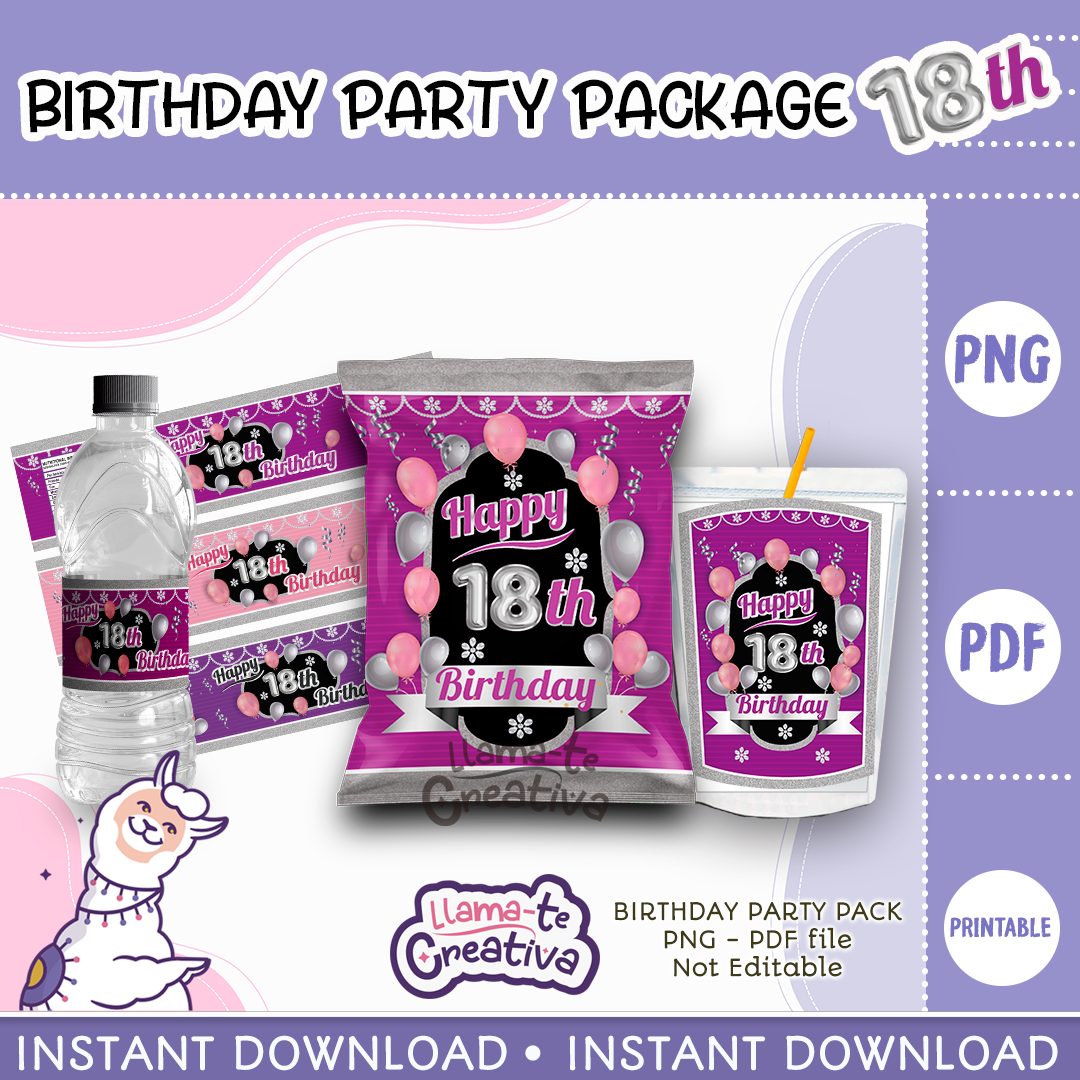Happy 18th Party Pack, Happy 18th Chip Bag, Bottle label and juice pouch bag label, instant download, not editable