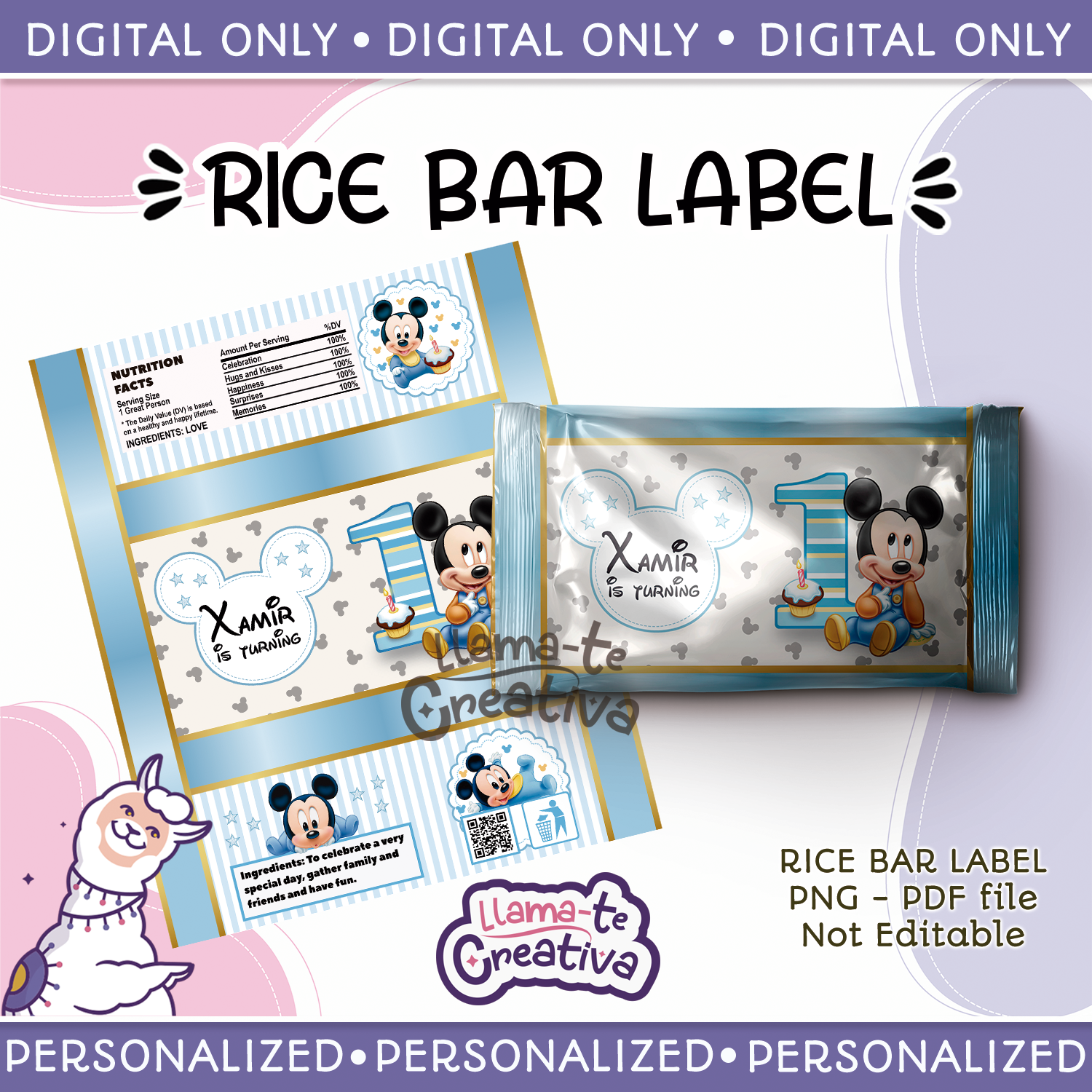 Mickey Baby Rice Bar Label Digital Printable, Personalized, not editable