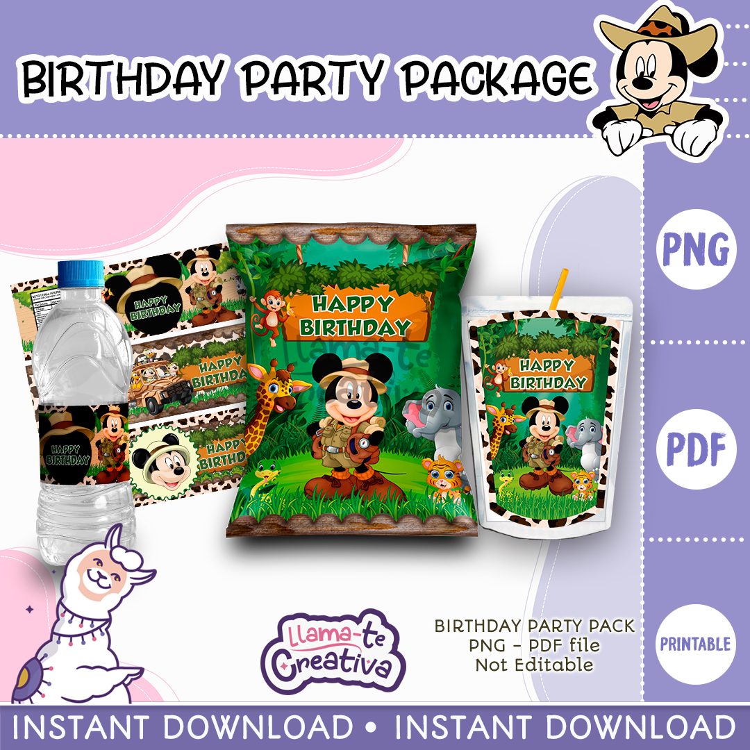 Mickey Safari Party Pack, Mickey Safari Chip Bag, Bottle label and juice pouch bag label, instant download, not editable