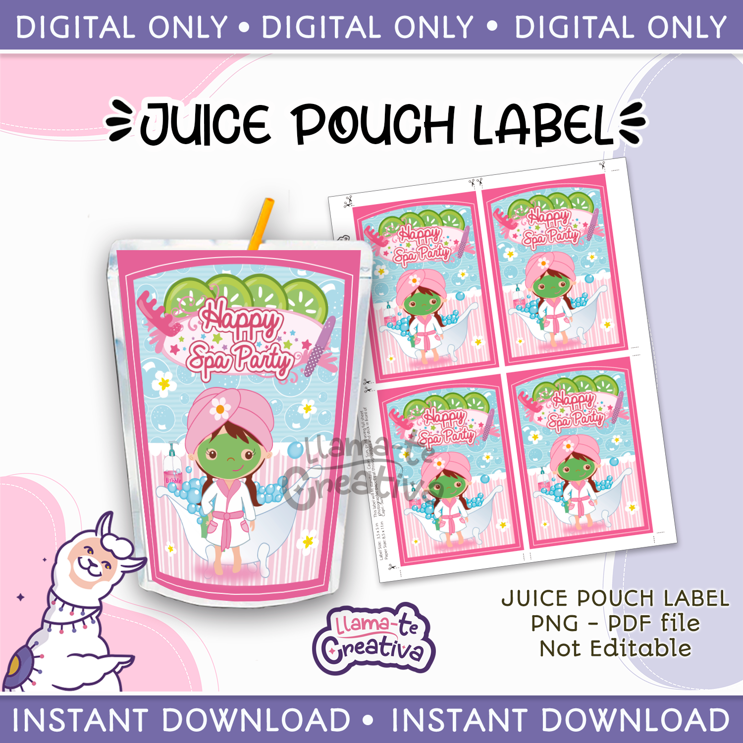 Spa party girls juice pouch bag label, Capri sun, Instant Download, not editable