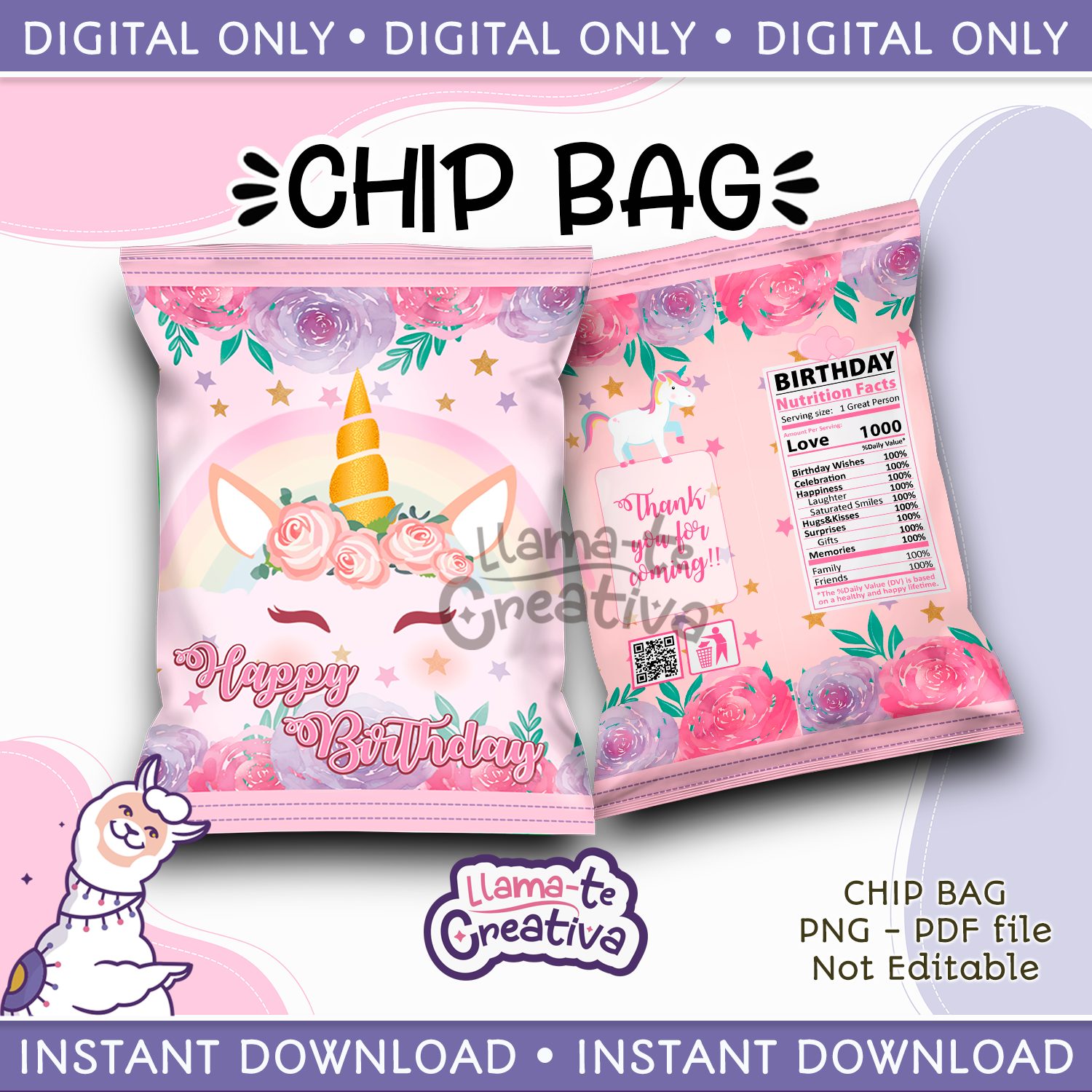 Unicorn Chip Bag, Instant Download, not editable