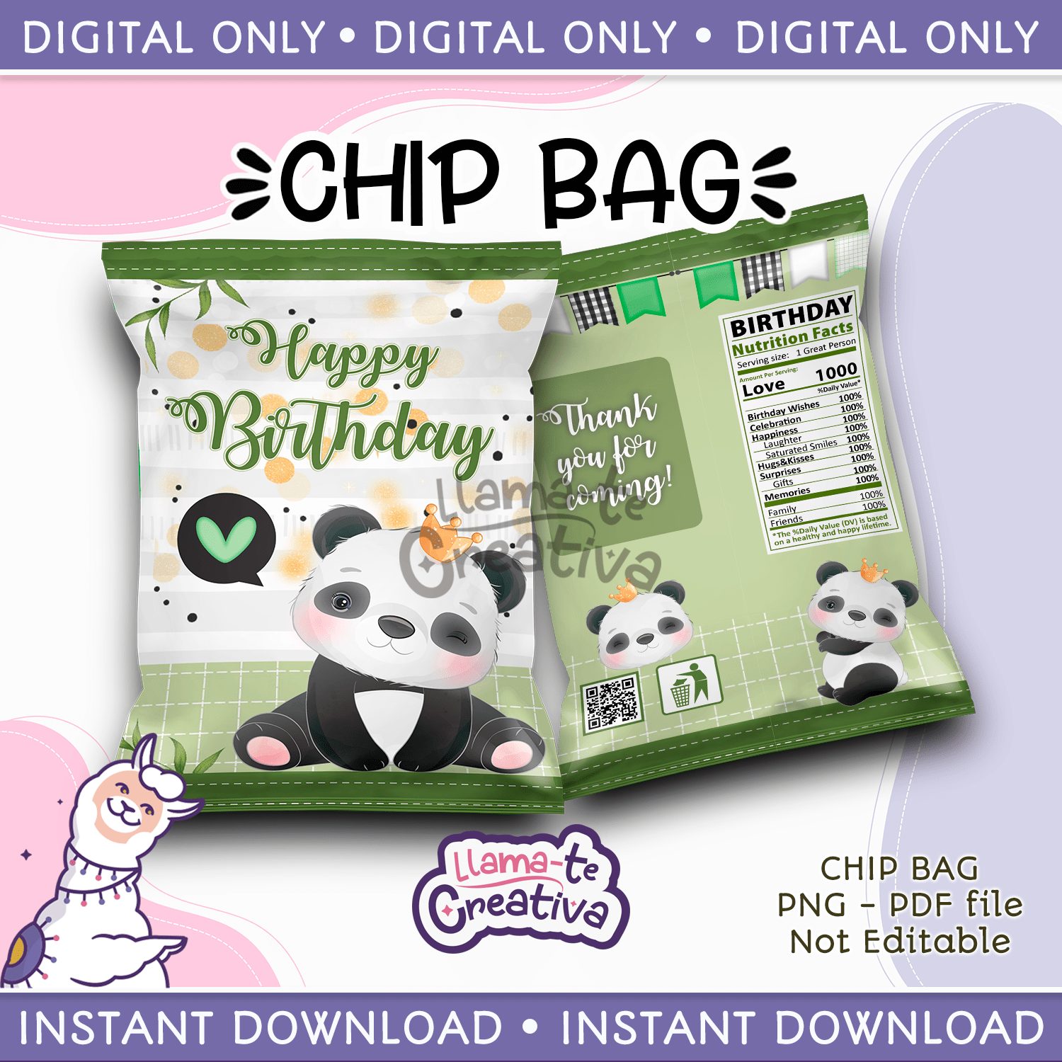Watercolor Panda Chip Bag, Instant Download, not editable